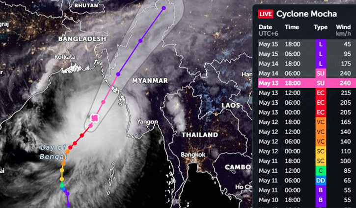উইন্ডি ডট কমের দেওয়া তথ্য অনুযায়ী, বাংলাদেশ সময় রাত ৮টার দিকে অতি প্রবল ঘূর্ণিঝড় মোখা সুপার সাইক্লোনে রূপ নেয়। এই মুহূর্তে ঘূর্ণিঝড়ের কেন্দ্রে বাতাসের গতিবেগ ঘণ্টায় ২৪০ কিলোমিটার।